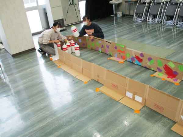 ペットボトルで作ったピンをソフトバレーボールやゴムボールで倒す遊び。周囲を段ボールで囲んでレーンを作るなど大掛かりな準備、投球の順番を意識した声掛けで児童が活動しやすい雰囲気でした。