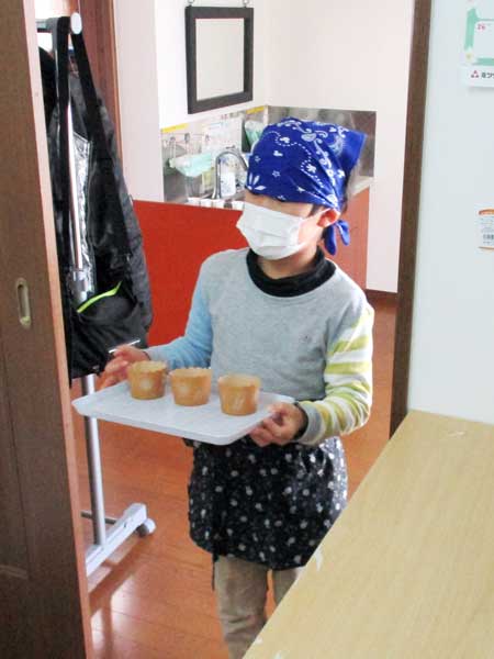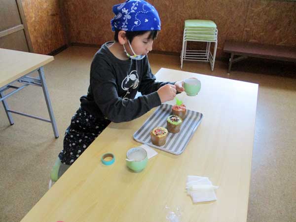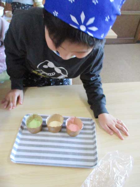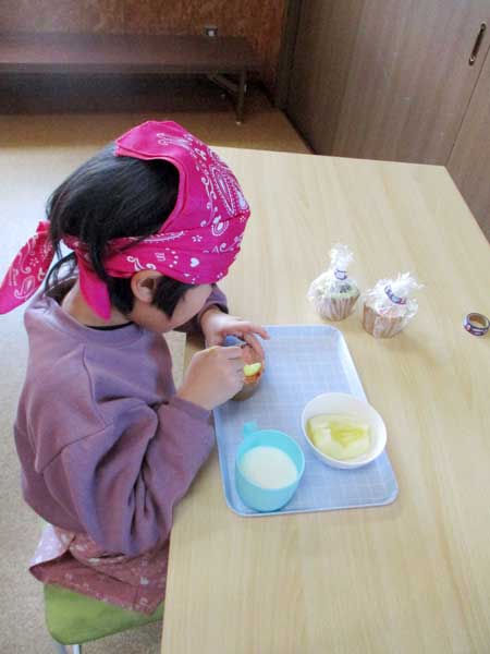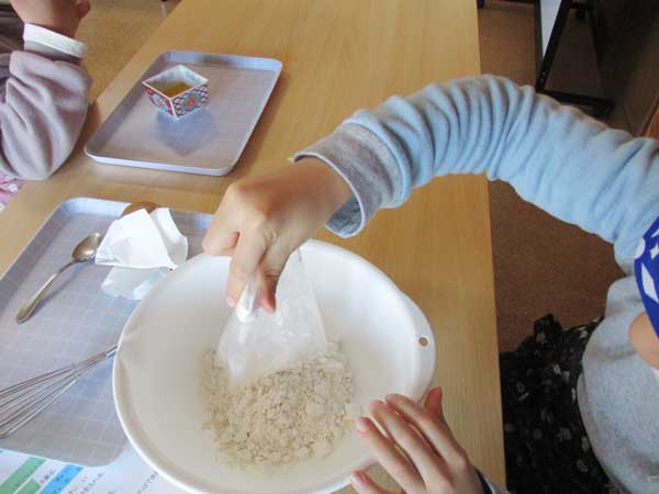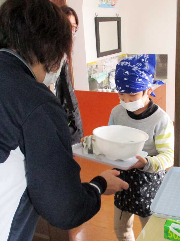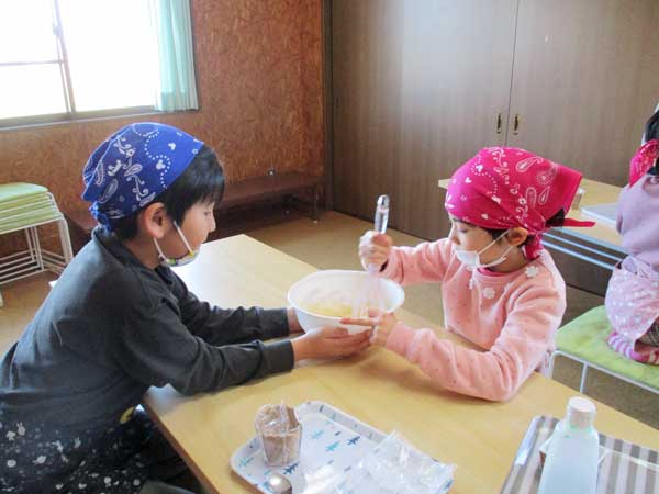 エプロンとバンダナを付けて、材料や調理器具を運んだり、友達を一緒に協力して混ぜたり、よく見て上手にできました。