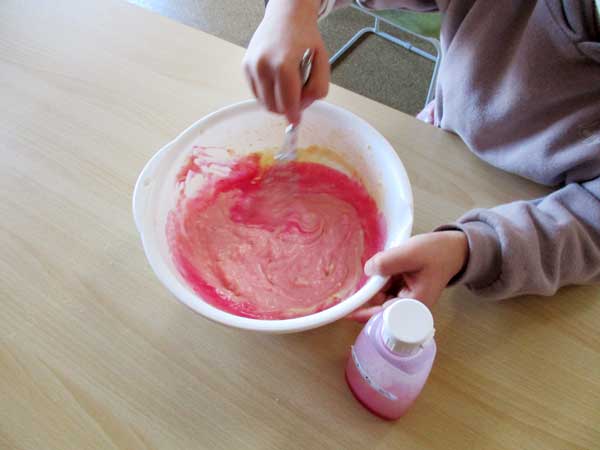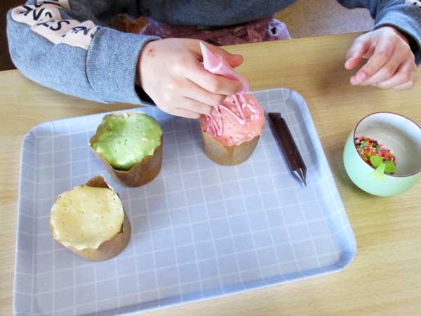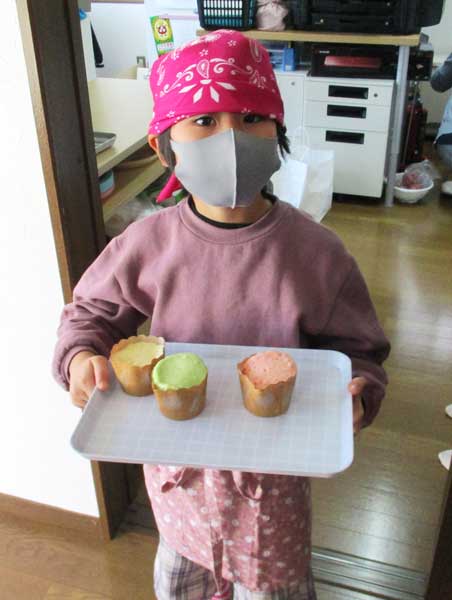 12月11日土曜日、軽食作りとして「カップケーキ」作りをしました。自分たちで牛乳や砂糖、メロンといちごのかき氷シロップを量って、混ぜてカラフルなカップケーキを作りました。