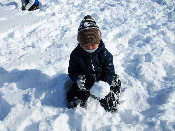 1月6日には、畑に積もった雪で雪だるま作りをしました。50㎝の大きさの雪だるまを目指して作りましたが、雪がさらさらしていたのでなかなか丸くならず苦戦していました。