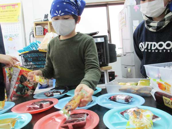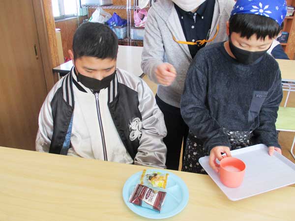 おやつの時間には、おやつ係がお皿におやつを並べたり、飲み物をコップに注いで準備して、注文した人のもとへおやつを届けました。