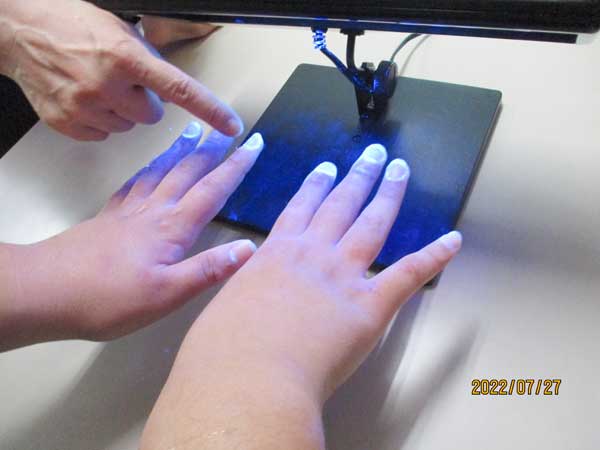 手に専用のジェルを塗り、その後にいつも自分がしている手洗いをしてもらいます。キレイに洗えているつもりでも、手洗いチェッカー(ブラックライト)に手をかざすと・・・洗い残しが光って見えます!