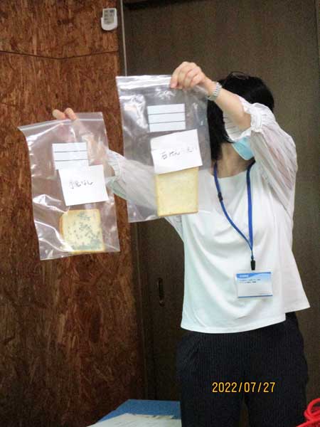 石けんで洗った手と、洗っていない手では、触った食パンのカビの生え方も大きく違います。カビの生えたパンを見て子どもたちは「えー!」と声をあげてびっくりしていました。