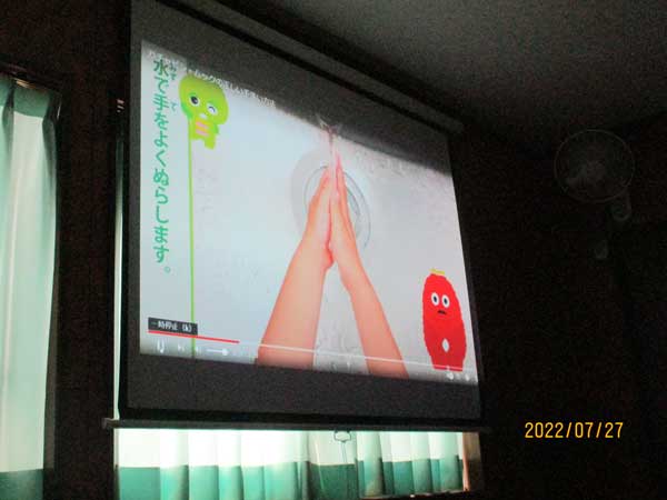 動画を見ながらキレイに手を洗う練習もしました。みんな真剣に手の動きをマネしていました。ご協力いただいた佐藤看護師、お忙しい中ありがとうございました。