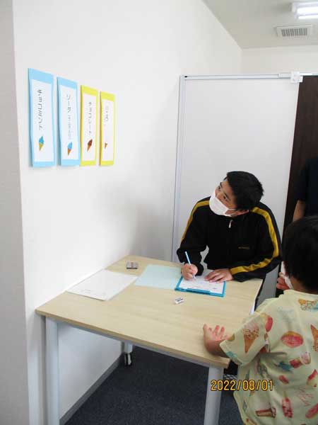 子どもたちが店員さん役とお客さん役に分かれて、自分の食べたいソフトクリームを注文します。店員さんは聞いた注文をしっかりメモして、お客さんの席まで届けます。暑い日に食べるソフトクリームに子どもたちは大満足でした。