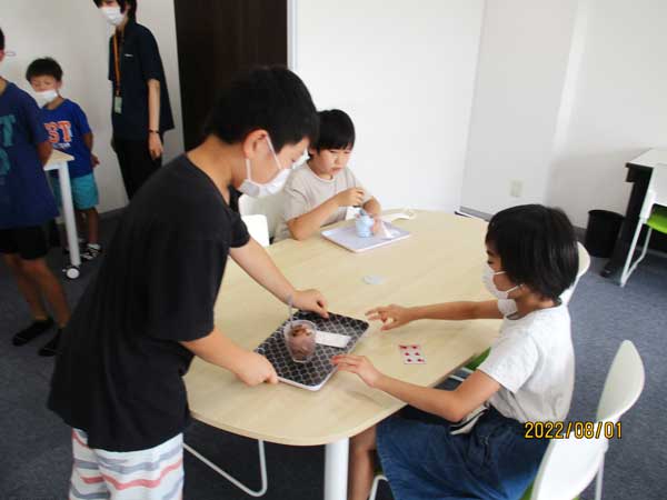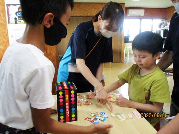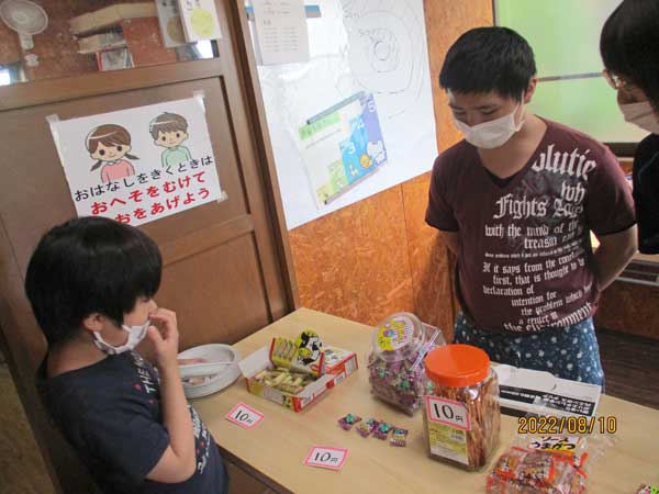 ソフトクリームと同じく、子どもたちが店員とお客さんに分かれて行いました。うまい棒や金平糖などのお菓子の他に、当てくじも用意しました。お小遣いは一人50円。紙のお金を使い、予算を考えながらお買い物をします。会計などのやり取りも子どもたちが頑張って行いました。