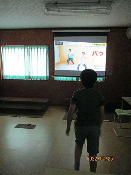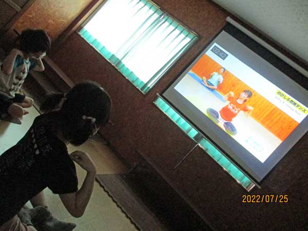 エクササイズは、プロジェクターに映った見本を見ながらリズムに合わせて体を動かしました。