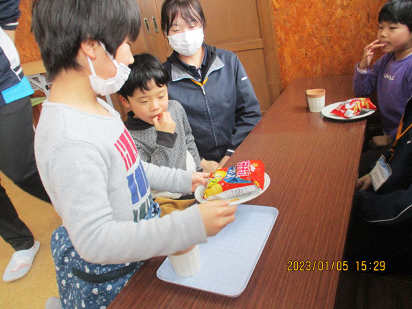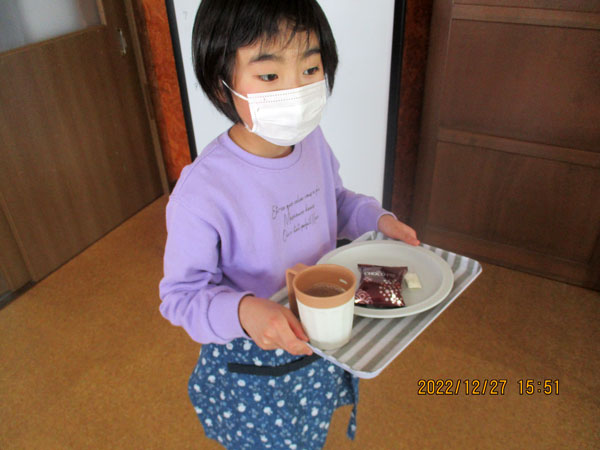 おやつでは、おやつ係としてみんなのおやつを準備したり、おやつを運んだりして接客の練習をしました。落ち着いておやつを運ぶことが出来ました。