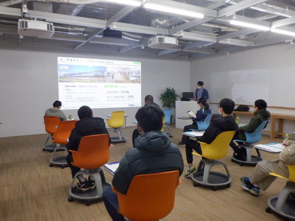 当日は、KDDIエボルバやまがたワークプレイスご担当者様より、会社内をご案内頂きながら働く方の仕事内容や社屋の特徴などについてご説明をいただきました。