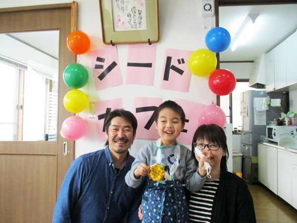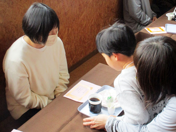 子どもたちが店員になり、保護者へ飲み物とお菓子を提供しました。エプロンをつけて子どもたちも普段と違うカフェの音楽が流れる環境の中ドキドキした様子でした。