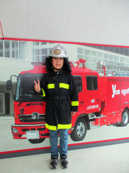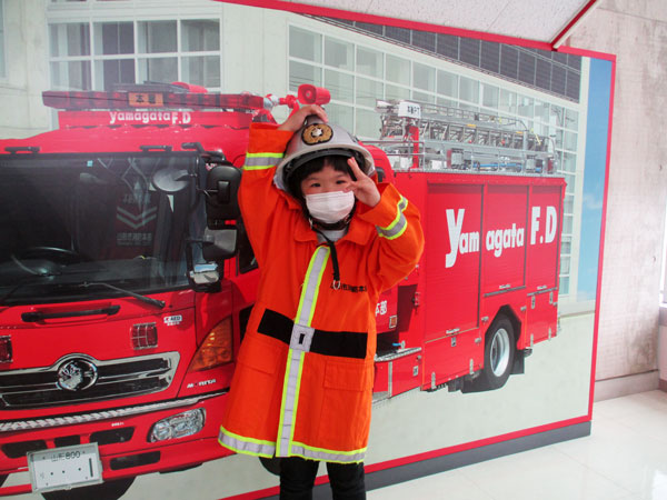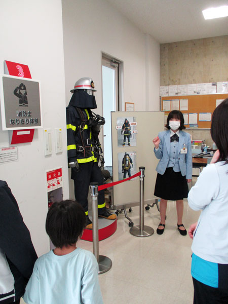 消防士なりきり体験。消防士さんが実際に身に付けている制服等の展示を見ながら説明を聞いたあと、消防自動車の写真を背景に、防火ヘルメット・防火衣を着て記念撮影。