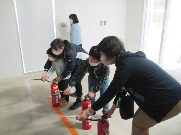 消火体験。初期消火の重要性を学ぶとともに、スクリーンを使い消火の方法や消火器の正しい使い方を体験しました。実際火事を見つけたら、小学生は大声で大人に助けを求め、安全な場所に逃げることと教えてもらいました。