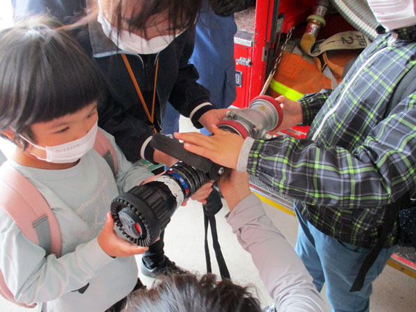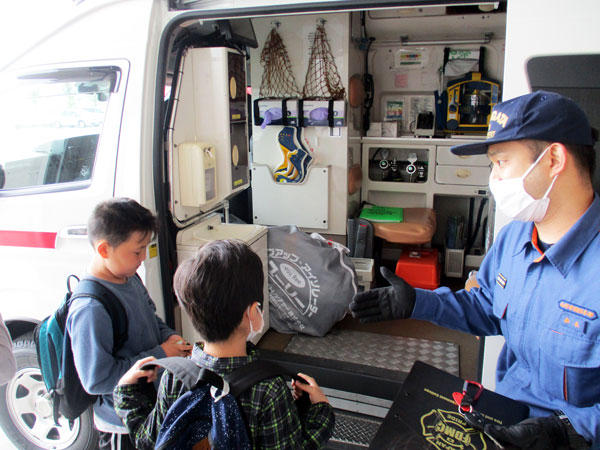 今回、市民防災センターさんのご厚意で、消防車、救急車を間近で見学させていただくことが出来ました。消防士さんの説明を聞きながら、細かいところまで見せていただきました。