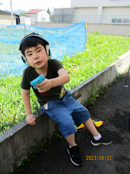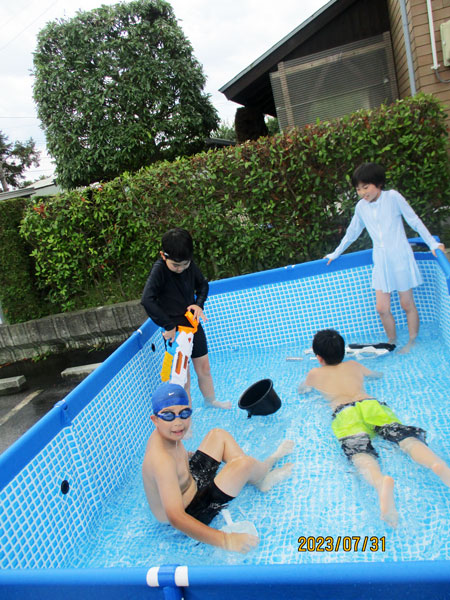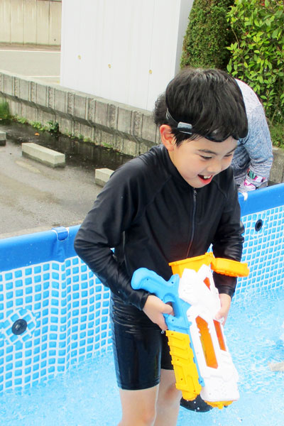 水鉄砲を手にお友達と打ち合ったり、水をかけあったり、シャワーの水を浴びたり、プカプカ浮かんでみたり...