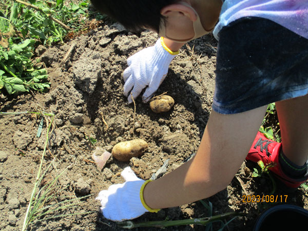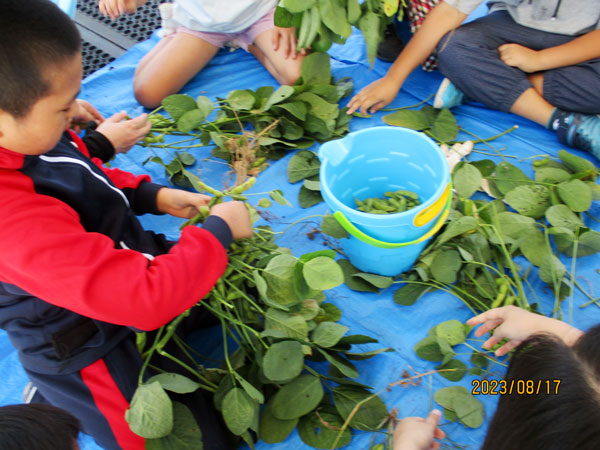 春に枝豆の種とジャガイモの苗を植えてからこの日を楽しみにしていました!当日は、暑い中みんなで協力して頑張って収穫してくれました。