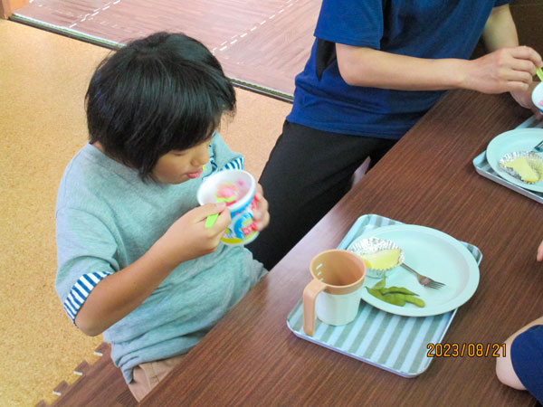 枝豆は塩味で、じゃがいもはじゃがバターにして、他のおやつと一緒に提供されました。みんな「美味しい!」と笑顔で食べていました。