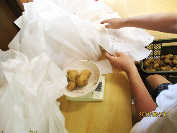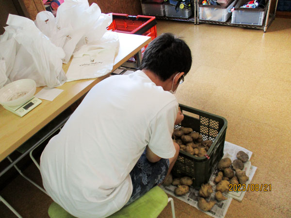 中学生にはじゃがいもを配るために、同じ重さになる様に計量して袋詰めしてもらいました。各家庭に配られ、調理して美味しく食べてくれたようです。