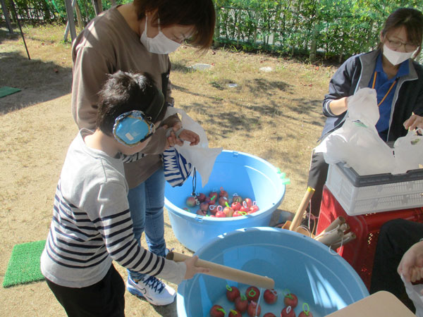 リンゴ釣りのコーナーでは、モールの輪っかがついたリンゴを、手作りの釣り竿で釣りあげます。釣れたリンゴはプレゼント!ゆらゆら揺れる釣り糸に苦戦しながらも、釣りあげられた時はみんな大喜びでした。