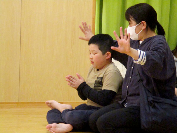 イベントコーナーのエクササイズでは、広い多目的室で職員の見本を見ながら、音楽に合わせて体を動かします。お子さんを膝の前に座らせて、触れ合いながら踊ることで、親子で体を動かす楽しさを感じてもらえたようです。