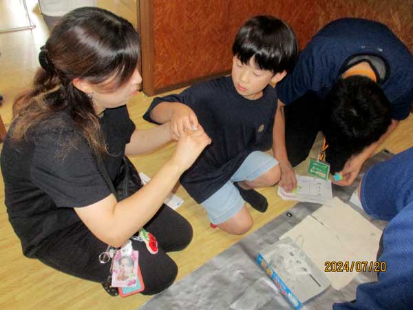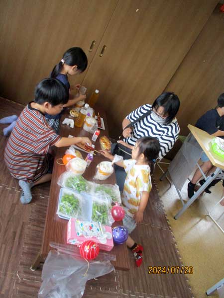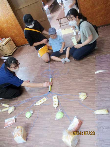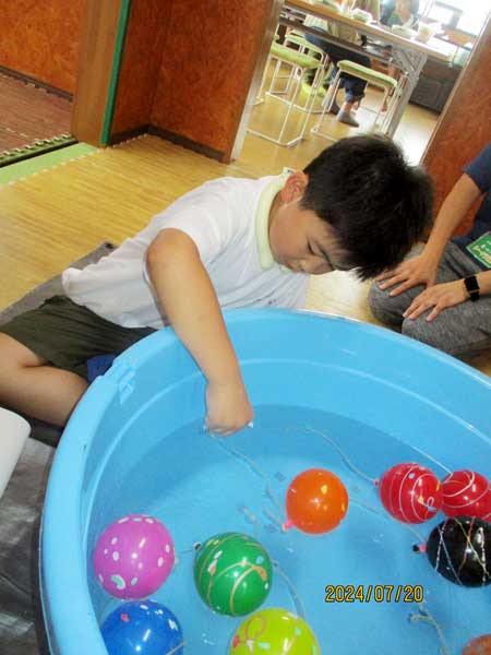 出し物はヨーヨー釣りとパンくじです!ヨーヨー釣りでは、こよりを家族で作ってもらい、たくさん取れるように工夫しました。