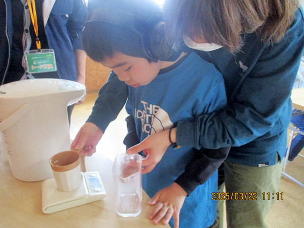 親子が全員集合したところで、親子でムース作りを開始しました。最初に粉ゼラチンをお湯で溶かします。熱いので慎重に量ります。