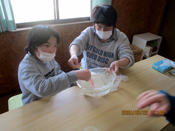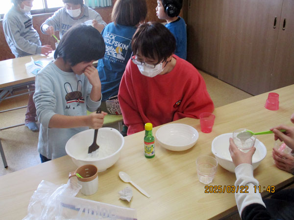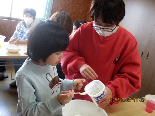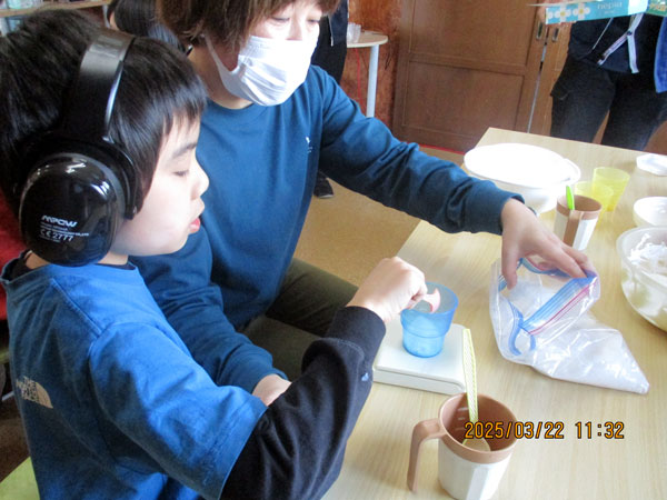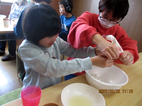 生クリームを搾り出したら、そこにヨーグルトを入れて混ぜます。お母さんと一緒にみんな楽しく混ぜていました。