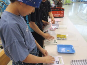 体験後の振り返りでは「始めはきんちょうしたけど、お客さんがいっぱい買ってくれてうれしい気持ちになりました」「次はお客さんがふくろを持ちやすくわたせるようがんばります」「しせいをよくするのを頑張った」など前向きな意見がたくさん出ていました。子どもたちにとっても貴重な経験となったようです。