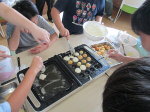 他にもホットプレートを使って、べっこう飴づくり、ベビーカステラづくりなどを行いました。混ぜる人、ボウルをおさえる人で役割分担したり、道具を順番に使うなど、コミュニケーションをとりながら楽しくおやつ作りができました。