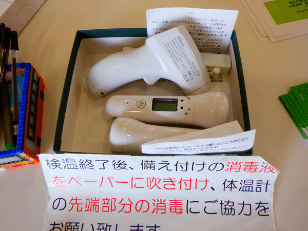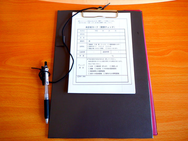 入り口にて体温計で検温させていただいております。来訪された方には「来訪者カード」のご記入をお願いしています。