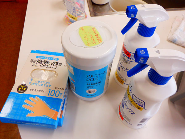 消毒に使用しているアイテムです。よく手の触れるところは毎日複数回消毒を行っています。