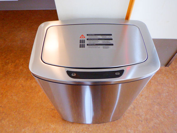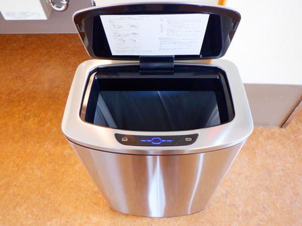 非接触型のゴミ箱も導入しました。センサーに手をかざすだけで蓋が開くようになっています。