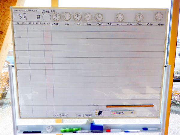 ホワイトボードで毎日自分の予定を確認して活動しています。予定確認も大事な社会生活スキルですね。