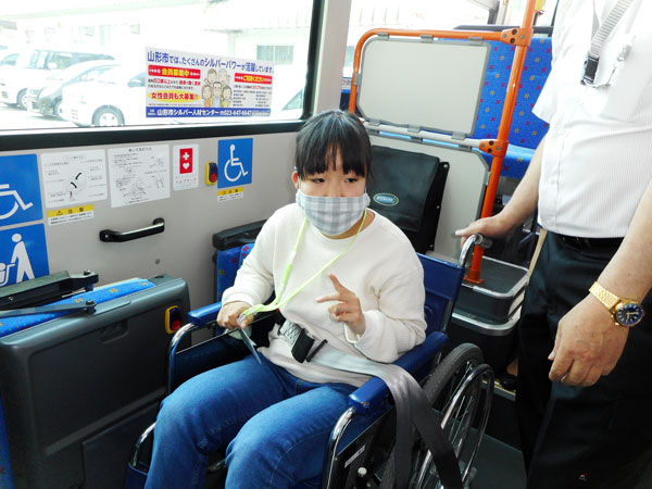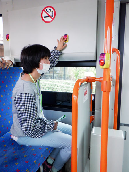 路線バスには優先席もあり、車いすで乗車する体験もさせていただきました。