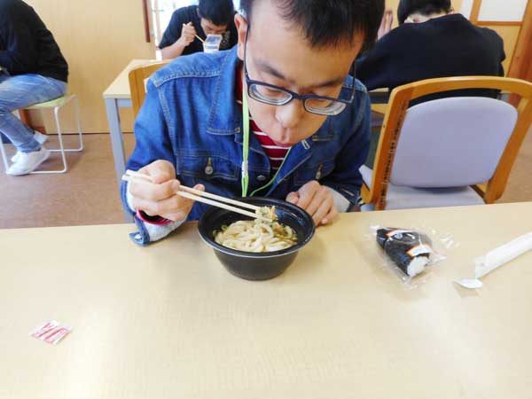 シードに到着し、うがい手洗いをしっかり済ませてからお昼を食べます。自分でお湯を入れてカップ麺を作る人やレンジでお弁当やパスタを温める人もいました。もちろん感染対策のため、間隔をあけてマスクを外したらお話をせず“黙食”でいただきました。