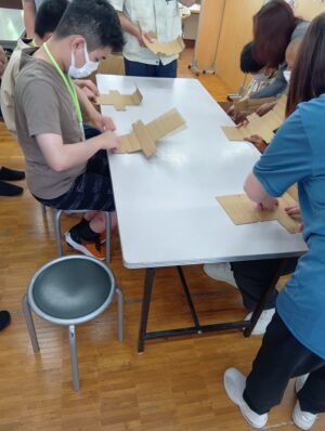 こんにゃく作りやしそ巻きをはじめとする、軽作業のご説明をいただきながら見学をさせていただきました。軽作業は実際に体験をさせていただき、とても良い経験になりました。利用者さんが店番・接客をしているさくらんぼ販売所では商品を購入させていただき楽しくお買い物が出来ました。生活介護では段ボールの箱折などをしており、自分で出来ることを増やすために日々頑張っているそうです。