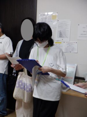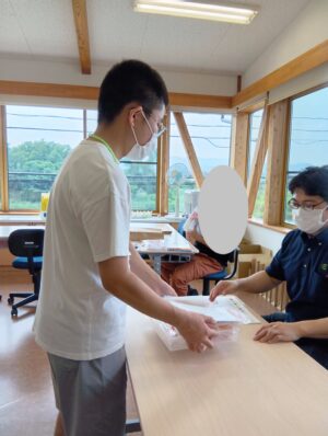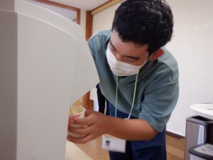 お家の人に飲み物を提供した後は、「ふうれ」の土曜開所にお邪魔し接客をさせていただきました。また、事務所内で事務仕事をしている職員にも突撃で「いらっしゃいませ(^▽^)」