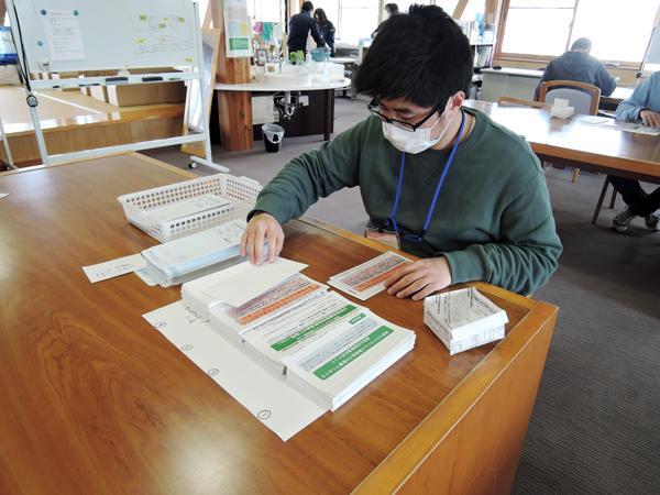先日コロニーの印刷工場よりお仕事の依頼をいただきました。4種類の三つ折された用紙を決められた順番に重ね、封筒に入れる作業です。