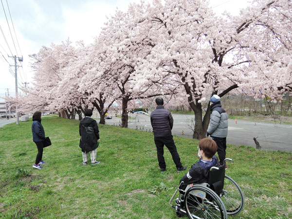 コロナの影響で遠出はせず、コロニー周辺を3班に分け坂巻公園周辺(Aコース)、土手周辺(Bコース)、農機連自動車学校・成沢西公園周辺(Cコース)の3コースに分かれて花見に行きました。桜は八分咲でしたが、どのコースも各々が桜を愛でたり写真を撮ったり、コミュニケーションをとったりとたくさんの笑顔が見られました。