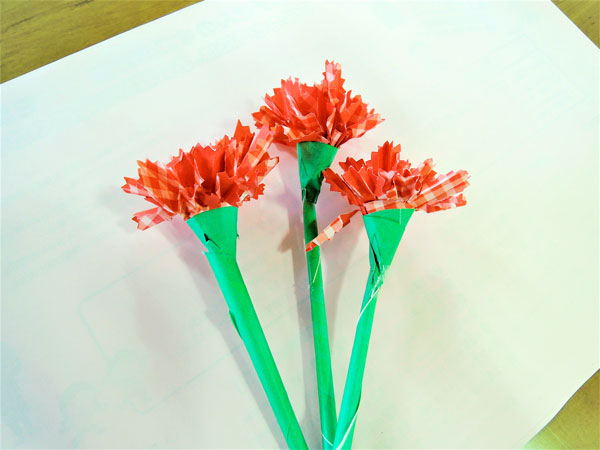 花のギザギザをハサミで切る作業に一苦労でしたが、完成した手作りのカーネーションは個性がありとてもかわいらしい!