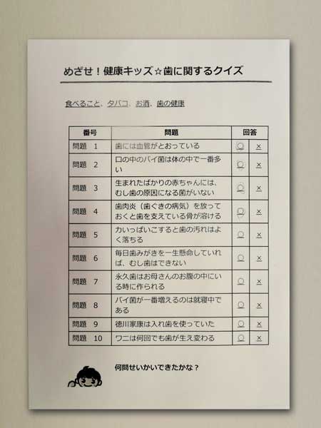 歯についてのクイズでは(徳川家康はツゲの木で作った入れ歯を使っていた)、(ワニは歯が抜けても新しい歯が生えてくる)など色んなクイズを楽しむ姿もたくさん見えました。