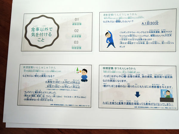 振り返りでは、毎日の運動30分を頑張って行いたい。糖質制限しすぎると身体のガソリンが足りなくなることを知りました。主食・主菜・副菜のバランスが重要だと知りました。栄養成分も確認するようにしたい。野菜ジュースも摂っていきたい。ポテトチップスやカップ焼きそばの食べ過ぎに注意します。など、みなさんが今回の栄養管理支援でしっかり学習し、食生活を見直すきっかけになったようでとても良かったです。