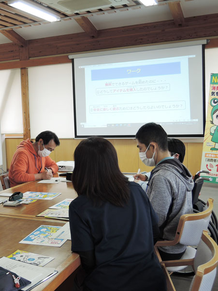 前半は『消費者トラブル』 事例のDVDを視聴し、各班に分かれて話し合いをしました。スマホゲームの高額課金について「金額を決めてやるとよい。」「課金をせずゲームをする」などの意見が聞かれました。