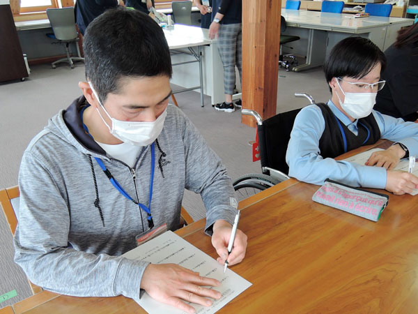 最後に、実演として毛布を活用した簡易担架の作り方を教えていただき、実際に、担架で運ばれる役と運ぶ役になり体験させていただきました。運ばれる役の方は『毛布なので気持ちが良いです』運ぶ役の方は『ドキドキしました』と感想があり、また、毛布の他にもパイプ椅子を用いた簡易担架を教えていただき、体験した利用者さんは「安定していますね」と、驚いた表情で話していました。
