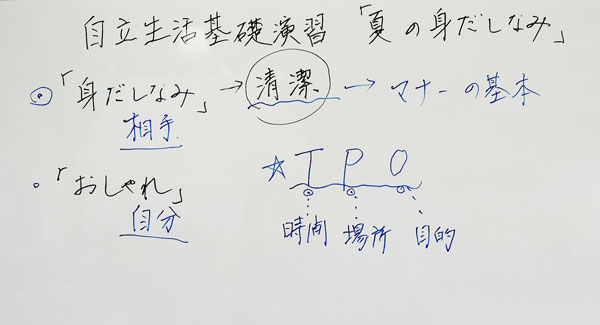 今回のテーマは「夏の身だしなみ」です。自立した生活に向け、特に汗やにおいの気になる「夏の身だしなみ」について、知識を増やし、実際の生活の中で実践していけるよう、セルフチェックや「汗・におい対策」の便利グッズ紹介、グループワークなどを行い、以下の内容を学びました。