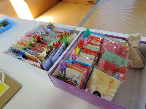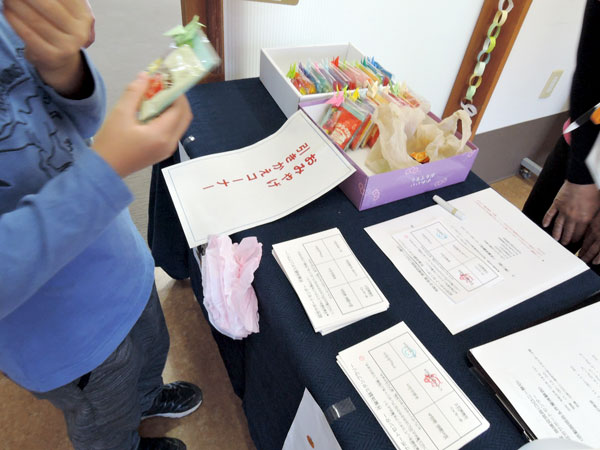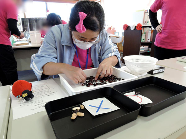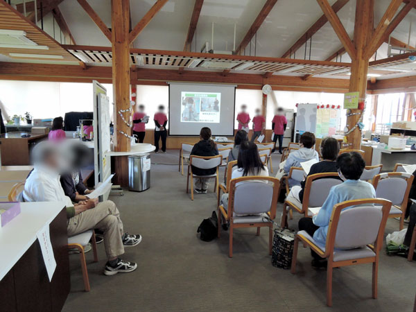 第1部の「作業説明会」では、お客様を前にして緊張した表情でしたが、真剣に堂々と発表ができました。声の大きさ・態度等これまでの練習の成果が充分に発揮されました。第2部の「作業体験会」では、それぞれ担当の作業をお客様に対して緊張しながらも丁寧に説明しており、時折笑顔もありました。