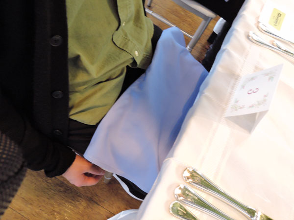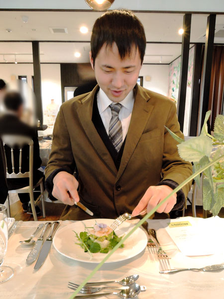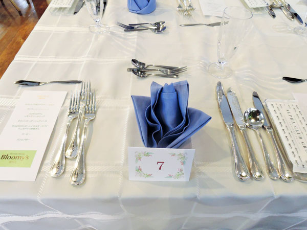 「ナイフとフォークは外側のものから使います」と教えていただいても不安な様子で恐る恐る手に取るみなさん。
