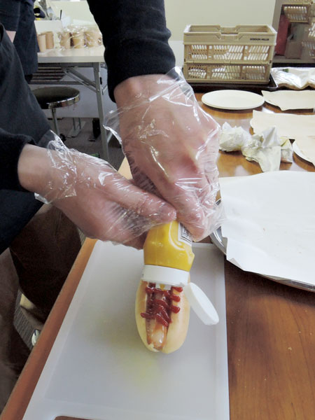 厨房係はソーセージを焼いて、パンにはさんでスタンバイ。