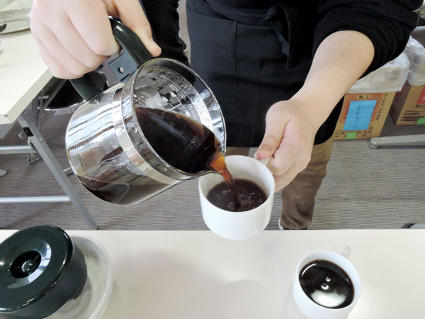 今回は普段の訓練の様子をご覧いただくことに。ワークシミュレーション接客の実践編で、ご家族をお客様に喫茶サービスでおもてなしします。