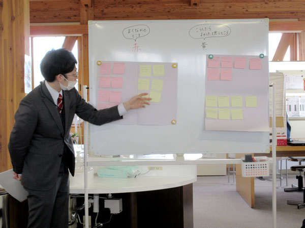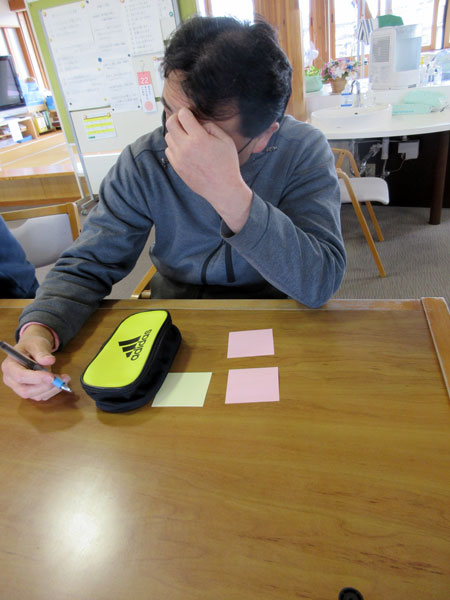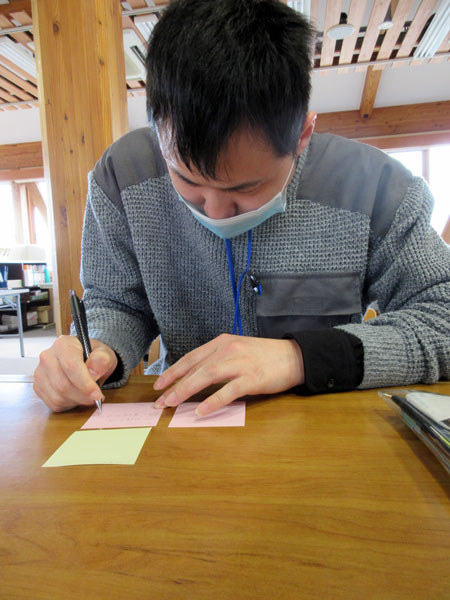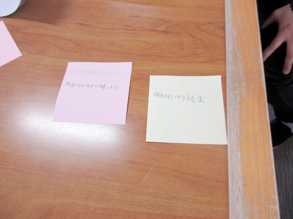 最初にDVDを見たあと、各グループに分かれ、主人公が『悪かったところ』をピンクの紙に、『こうしたらよかったんじゃないか』を黄色の紙に各自書きだしました。