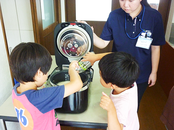 にんじん、じゃがいも、玉ねぎを畑で収穫したり、玉ねぎの皮むきをしたり、米とぎをしたり、包丁で野菜を切ったり、親子でたくさんの体験ができました。